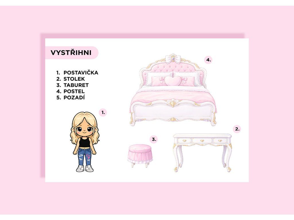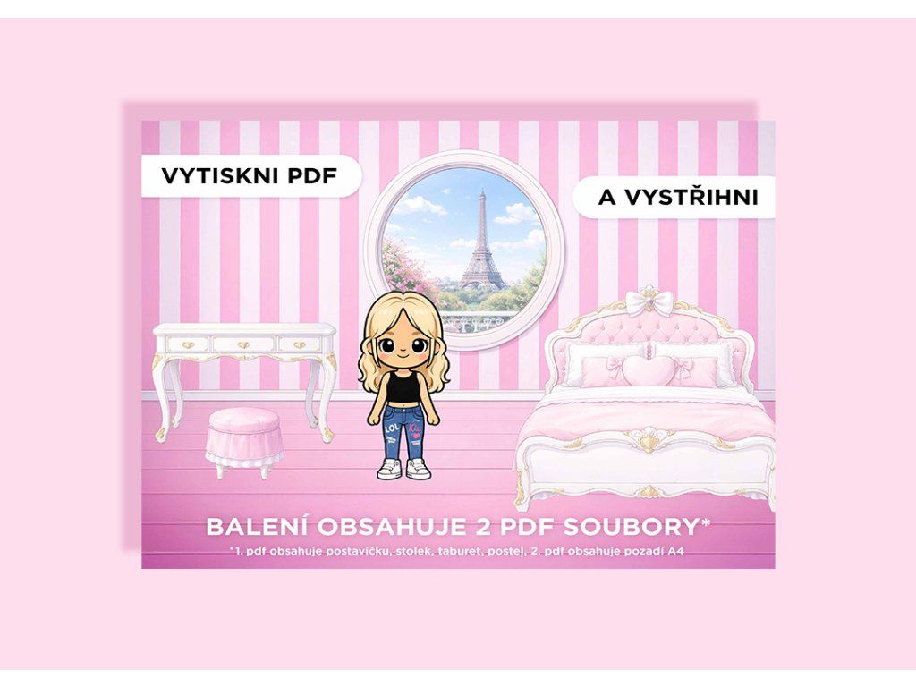 Obsah balení: 2 PDF (postavička + nábytek, pozadí pokojíčku A4)