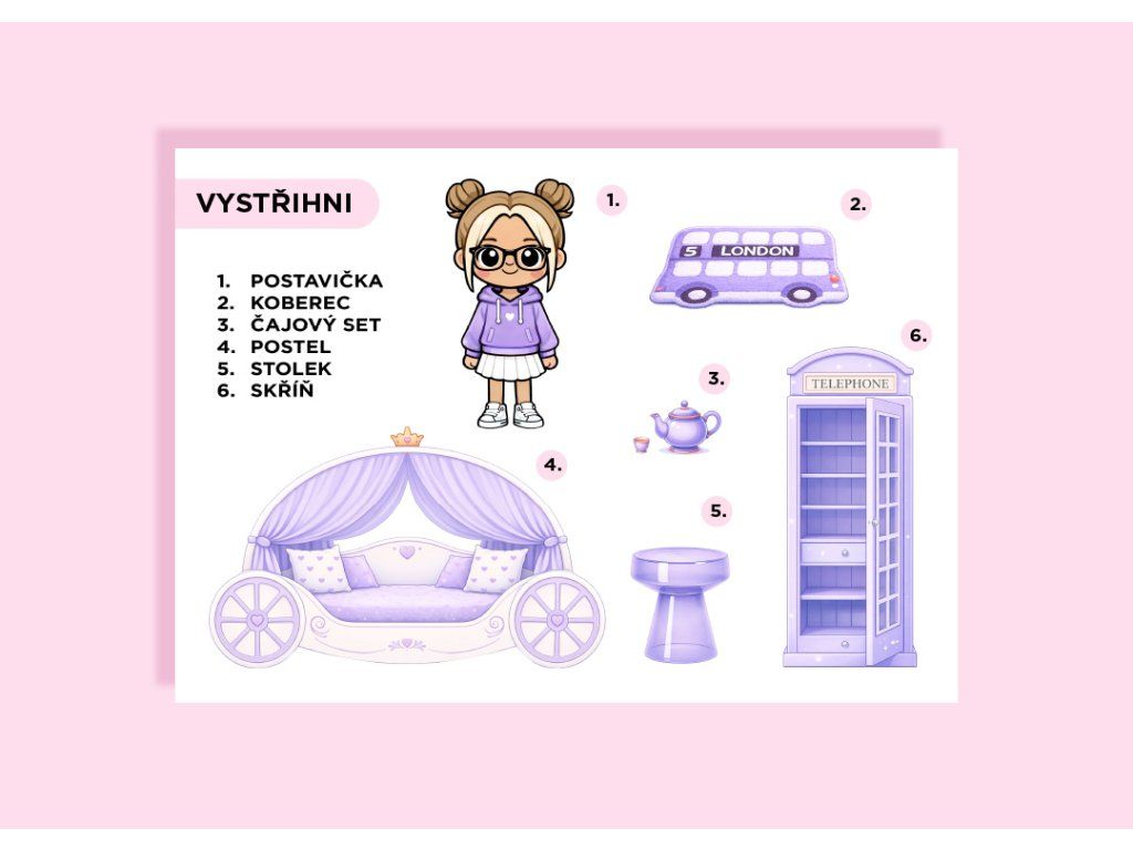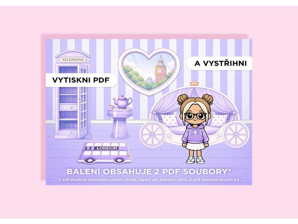 Obsah balení: 2 PDF (postavička + nábytek, pozadí pokojíčku A4)